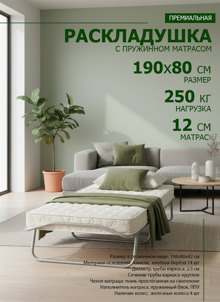 Раскладушка с пружинным матрасом 12 см, на ламелях, размер 198 х 80 см / Жуковка New